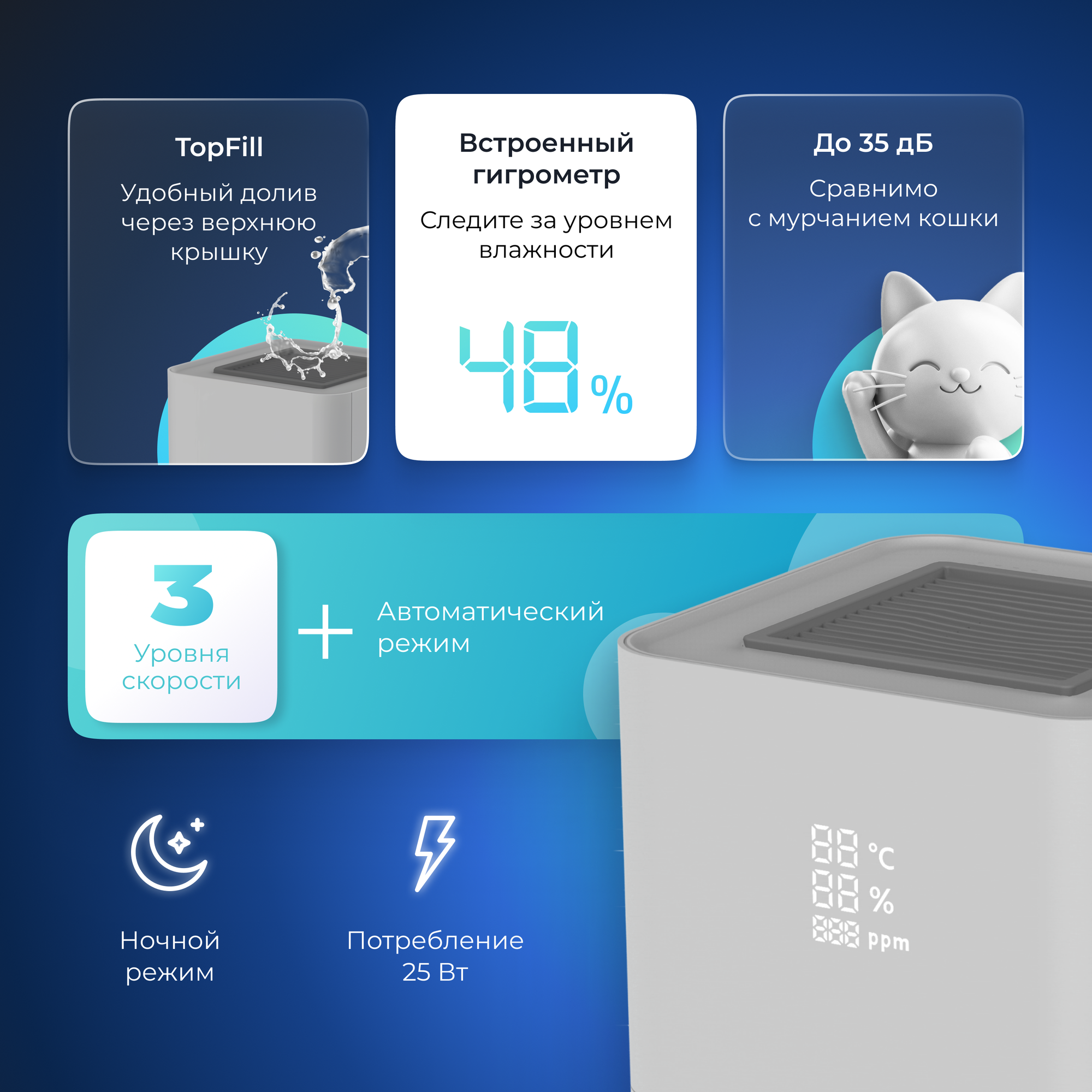 | Особенности | дисплей / индикация работы / регулировка скорости вентилятора/интенсивности испарения / таймер / увлажнение воздуха / управление со смартфона |