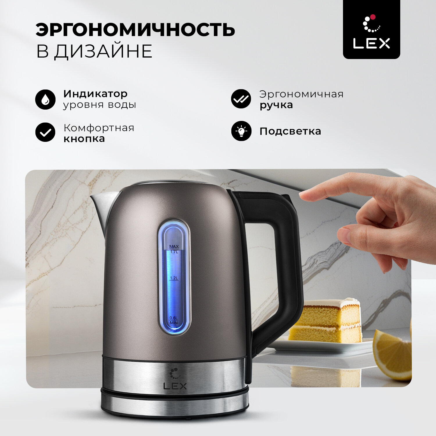 Отзывы на Чайник электрический с подсветкой LEX LX 30018-3, пищевая сталь SUS304, плавное открывание крышки, блокировка включения без воды, защита от перегрева.