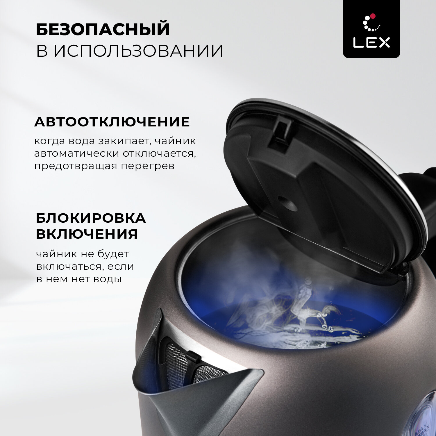Чайник электрический с подсветкой LEX LX 30018-3, пищевая сталь SUS304, плавное открывание крышки, блокировка включения без воды, защита от перегрева. информация:
