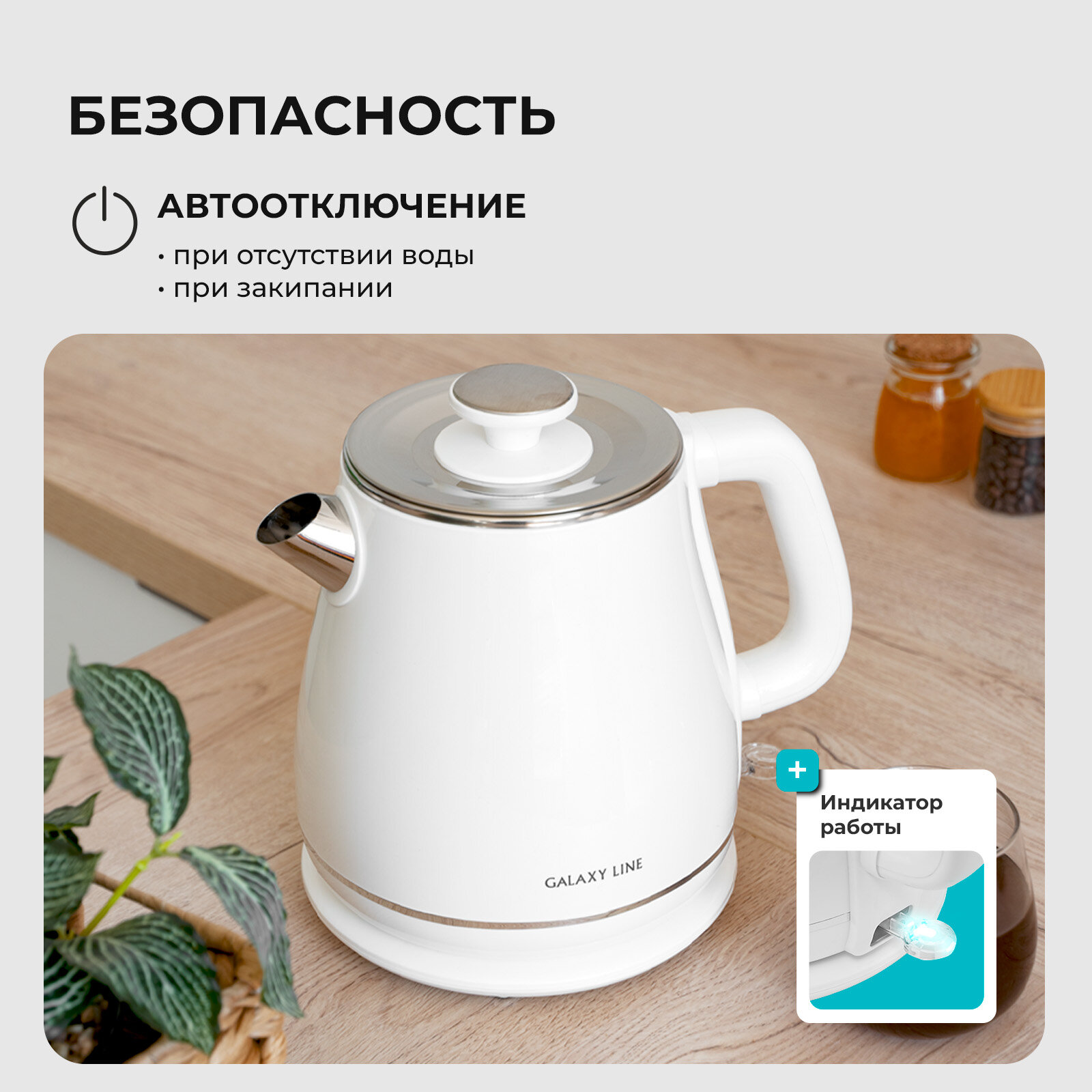 Чайник электрический GALAXY LINE GL 0331, белый, пластик, двойная стенка из нержавеющей стали AISI 304 и пищевого пластика, 2200 Вт, 1,8 л, индикатор работы информация: