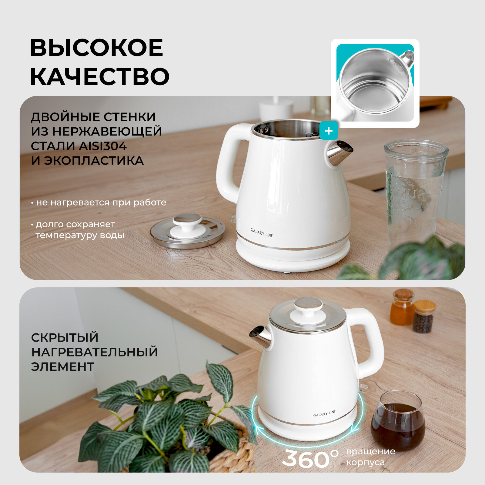 10 цен на Чайник электрический GALAXY LINE GL 0331, белый, пластик, двойная стенка из нержавеющей стали AISI 304 и пищевого пластика, 2200 Вт, 1,8 л, индикатор работы
