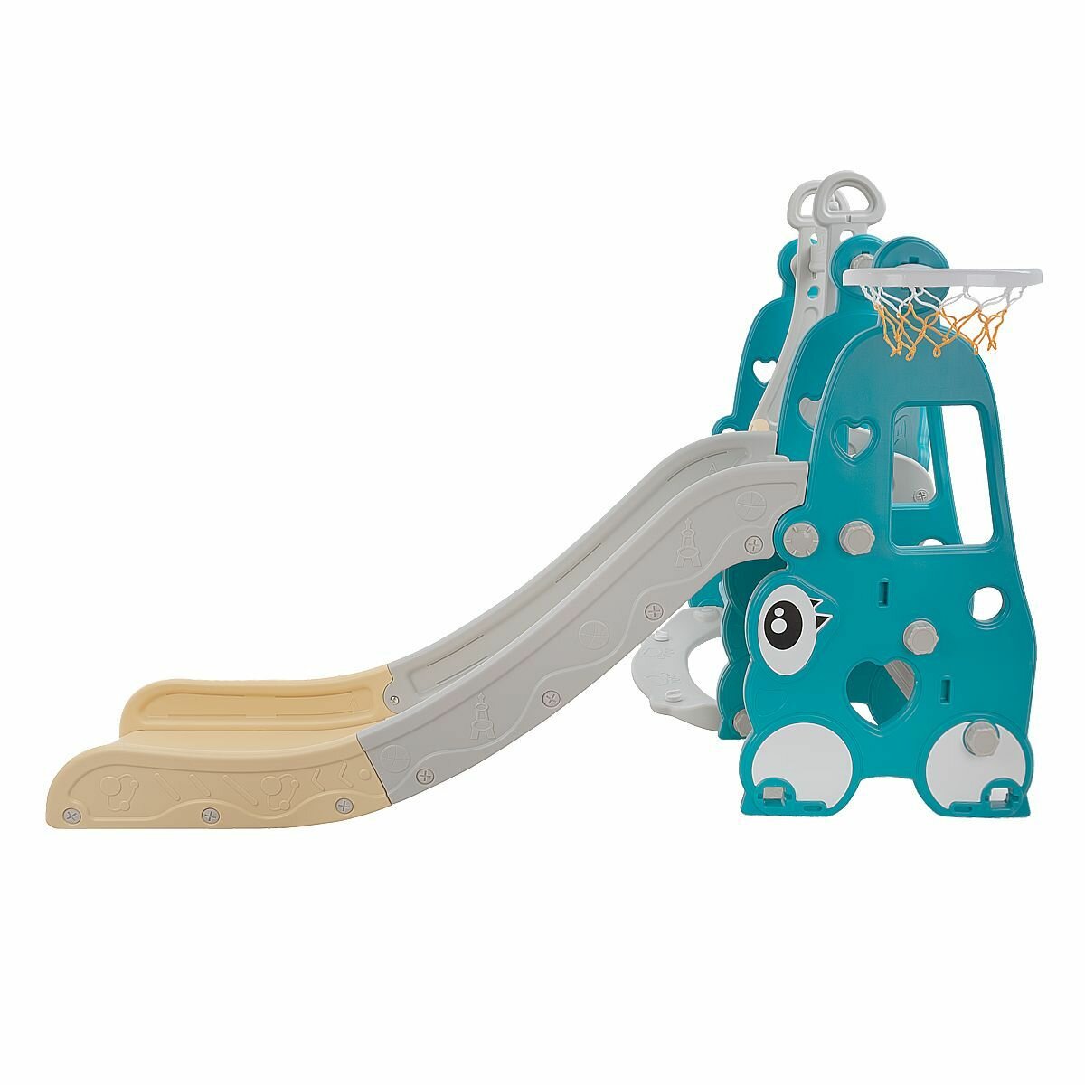 Горка-комплекс Pituso Замок с качелями, баскетбольным кольцом и с музыкальным элементом с подсветкой, 185х146х122 см, бежевый /серый