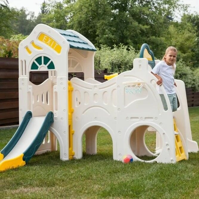 | Комплектация | Горка, лестница, баскетбольное кольцо, домик, игровой модуль, мост, крыша. |