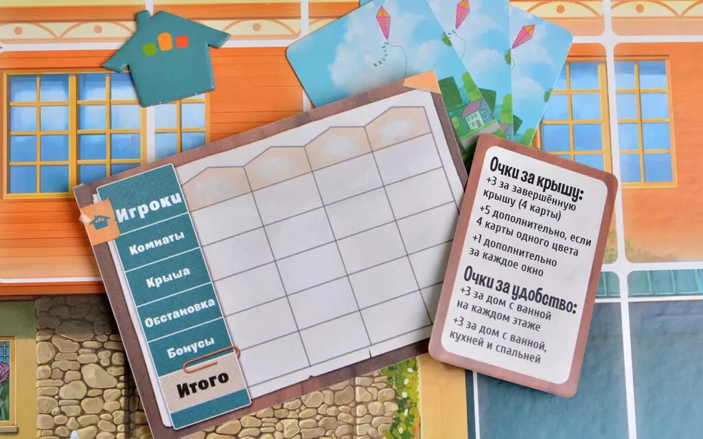 | Комплектация | игровой планшет, 4 планшета домов, 60 карт комнат, 28 карт крыш, 20 карт инструментов, обстановки и помощников, 11 жетонов обстановки, жетон первого игрока, 1 блокнот для подсчёта очков, 4 памятки, правила игры |