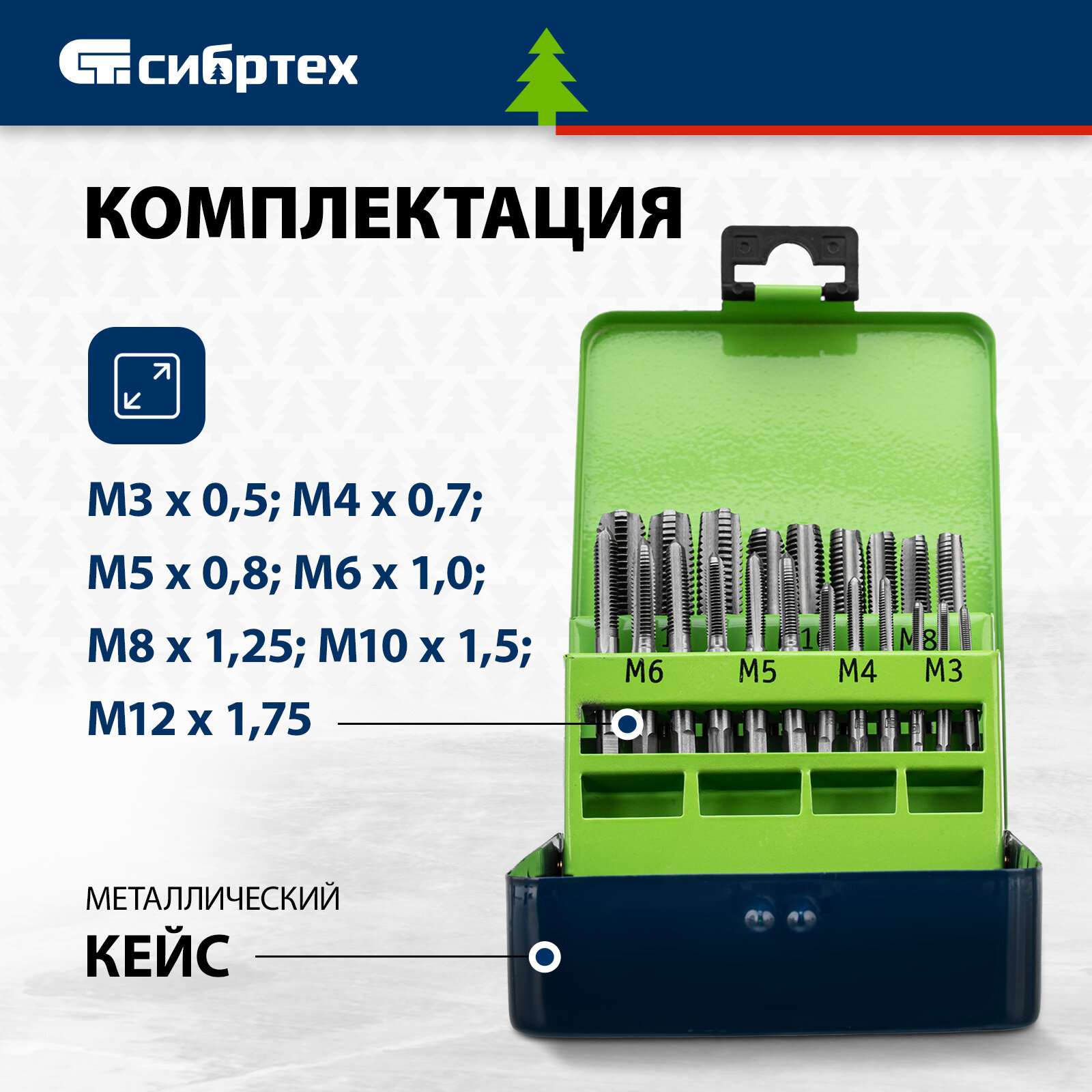 | Подробная комплектация | Метчики №1, №2 и №3 размеров М3 х 0,5, М4 х 0,7, М5 х 0,8, М6 х 1,0, М8 х 1,25, М10 х 1,5, М12 х 1,75 |