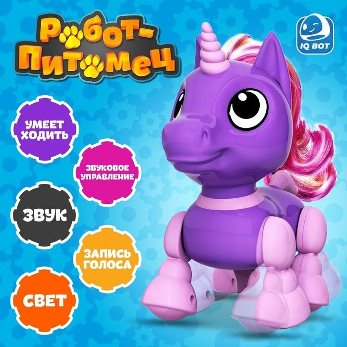 Робот единорог "Питомец" IQ BOT, интерактивный: с записью звуков, реагирует на хлопки, звук, свет, на батарейках, фиолетовый информация: