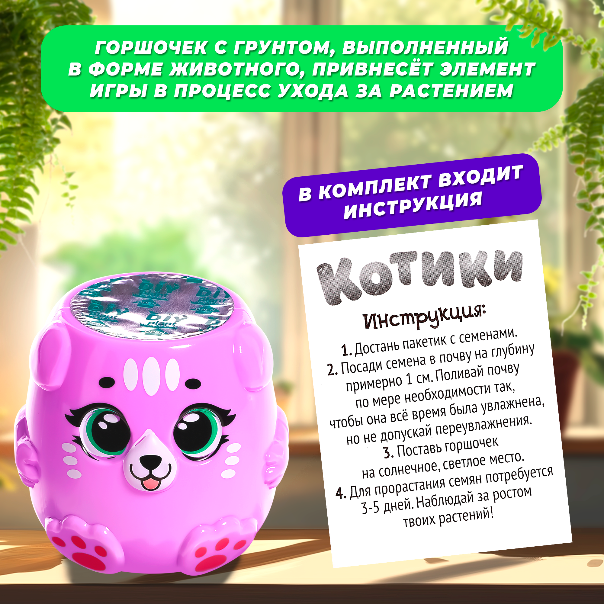 Набор для опытов "Котики. Выращиваем травку", фиолетовый горшочек, Эврики kids информация: