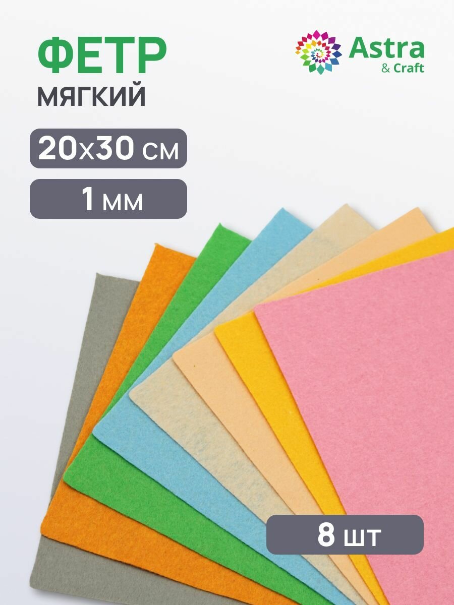 Набор фетра мягкого листового ассорти, 1 мм, 20х30 см, 8 шт, Astra&Craft (1) информация: