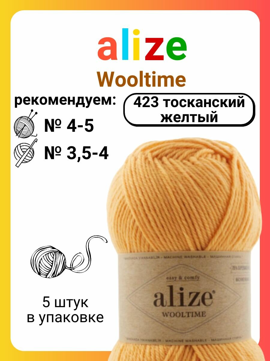 Пряжа Alize Wooltime тосканский желтый (423), 75%шерсть/25%полиамид, 200м, 100г, 5шт