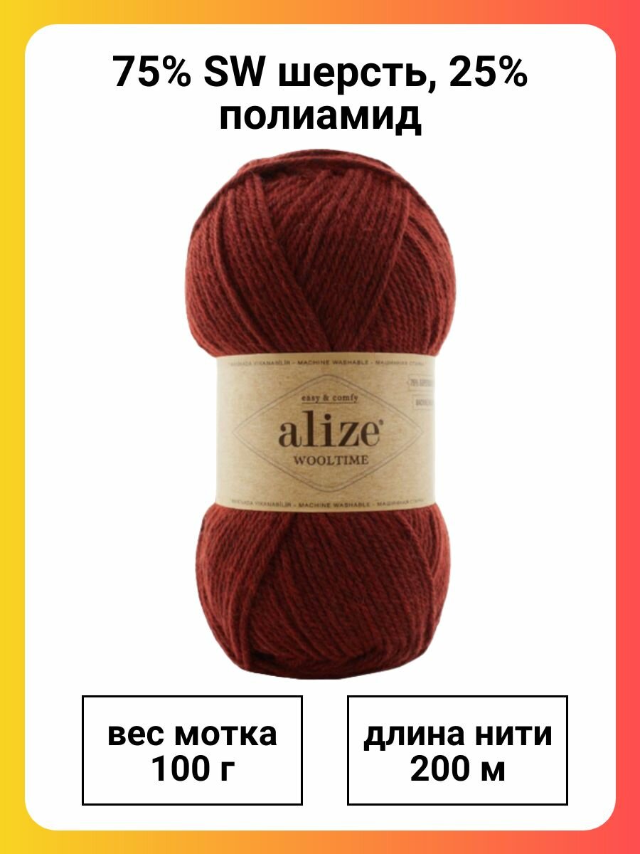 Пряжа для вязания Alize Wooltime, цвет 588 терракот, 100г, 200м, 5шт/упак 1 850 ₽