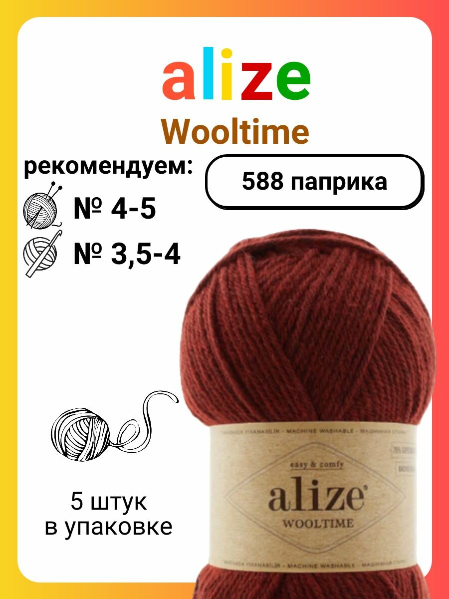 10 цен на Пряжа ALIZE Wooltime Суперваш Вултайм 5*100г*200м цвет 588 Паприка