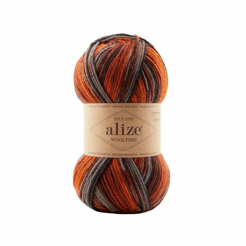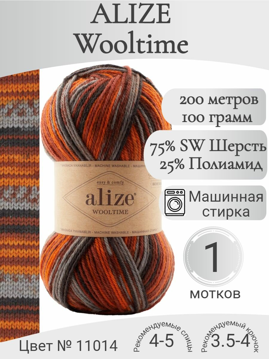 10 цен на Пряжа Alize Wooltime Ализе ВулТайм, 11014 оранжевый/терракот/серый, 75% шерсть, 25% полиамид, 100 г, 200 м, 1 моток.