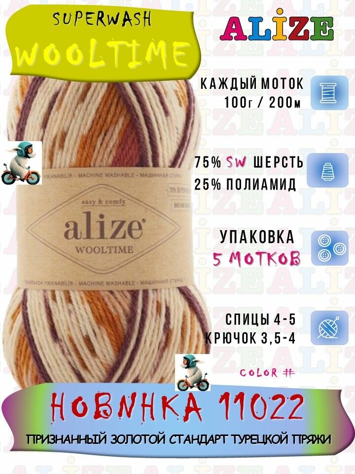 Пряжа Wooltime, Alize, принт - 11011, 75% SW шерсть, 25% полиамид, 5 мотков, 100 г., 200 м. 2 071 ₽