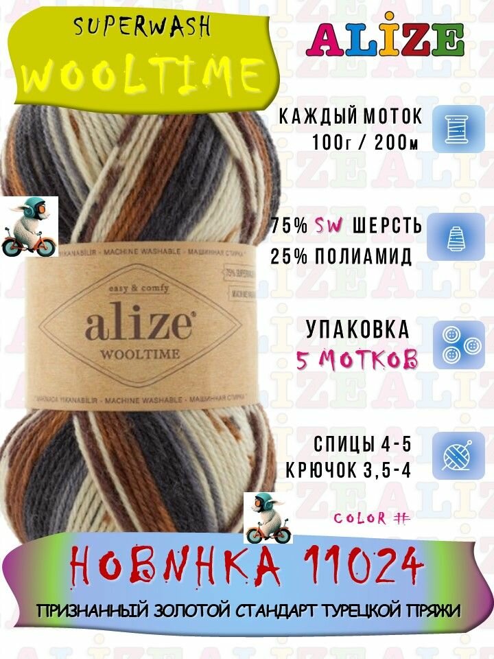 Пряжа Wooltime, Alize, принт - 11011, 75% SW шерсть, 25% полиамид, 5 мотков, 100 г., 200 м. 2 071 ₽