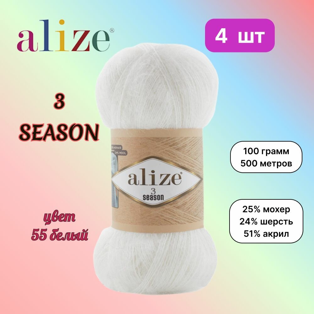 Пряжа ALIZE 3 Season: 55 (белый), 4 шт 500м 100г, 25% мохер, 24% шерсть, 51% акрил информация: