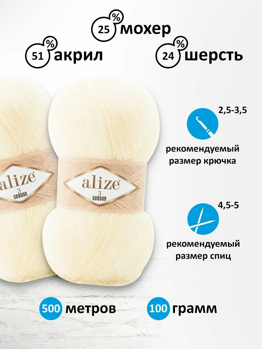 Пряжа Alize 3 Season молочно-бежевый (67), 25%мохер/24%шерсть/51%акрил, 500м, 100г, 2шт 879 ₽