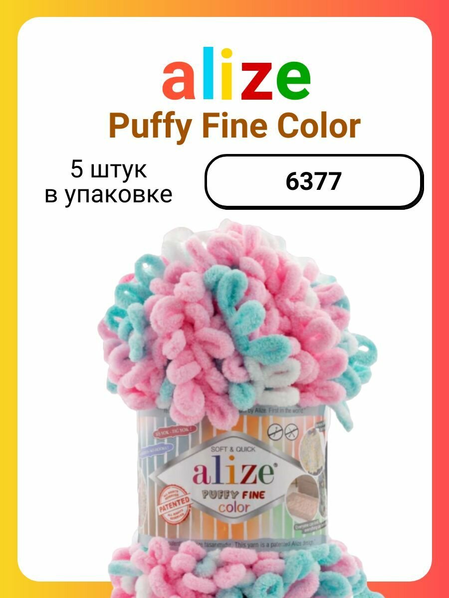 Пряжа PUFFY FINE COLOR (Alize), бел/бирюз/яр.розов - 6377, 100% микрополиэстер, 5 мотков, 100 г., 14 м. информация: