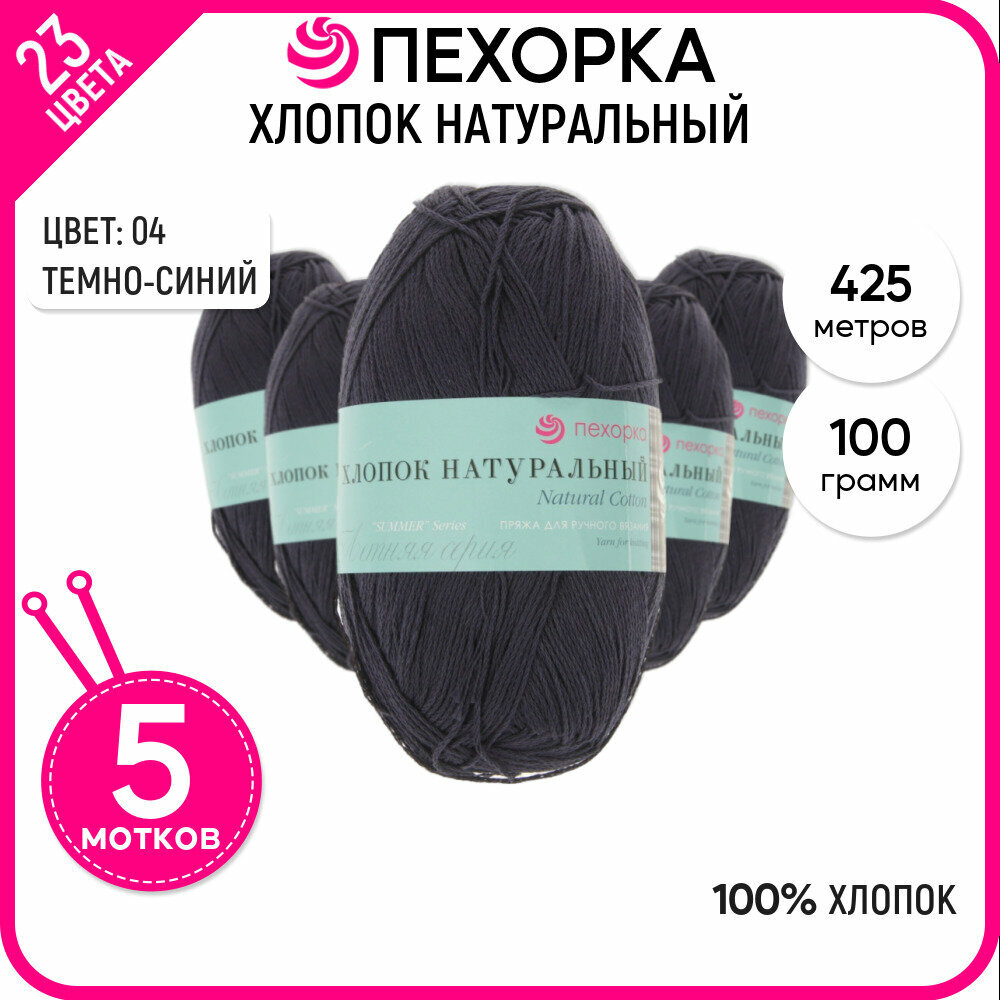 Пряжа для вязания Пехорка 'Хлопок натуральный 'Кабле' 100г, 425м (100% хлопок) (04 темно-синий), 5 мотков информация: