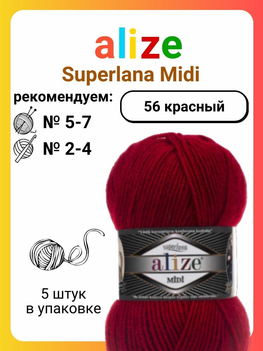 Пряжа ALIZE SUPERLANA MIDI, красный - 56, 25% шерсть, 75% акрил, 5 мотков, 100 г, 170 м.