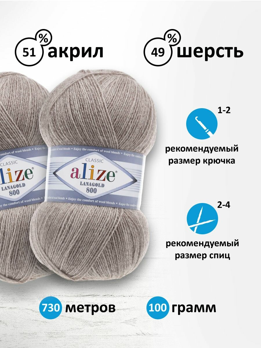 Пряжа ALIZE LANAGOLD 800, св. коричневый - 207, 49% шерсть, 51% акрил, 5 мотков, 100 г, 730 м.
