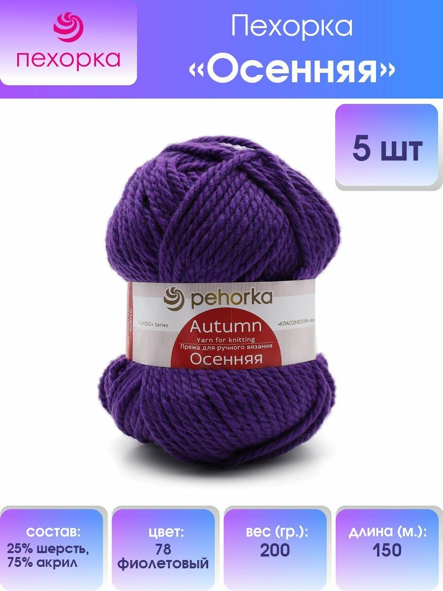 Пряжа для вязания Пехорка 'Осенняя' 200г, 150м (25% шерсть, 75% акрил) (78 фиолетовый), 5 мотков информация: