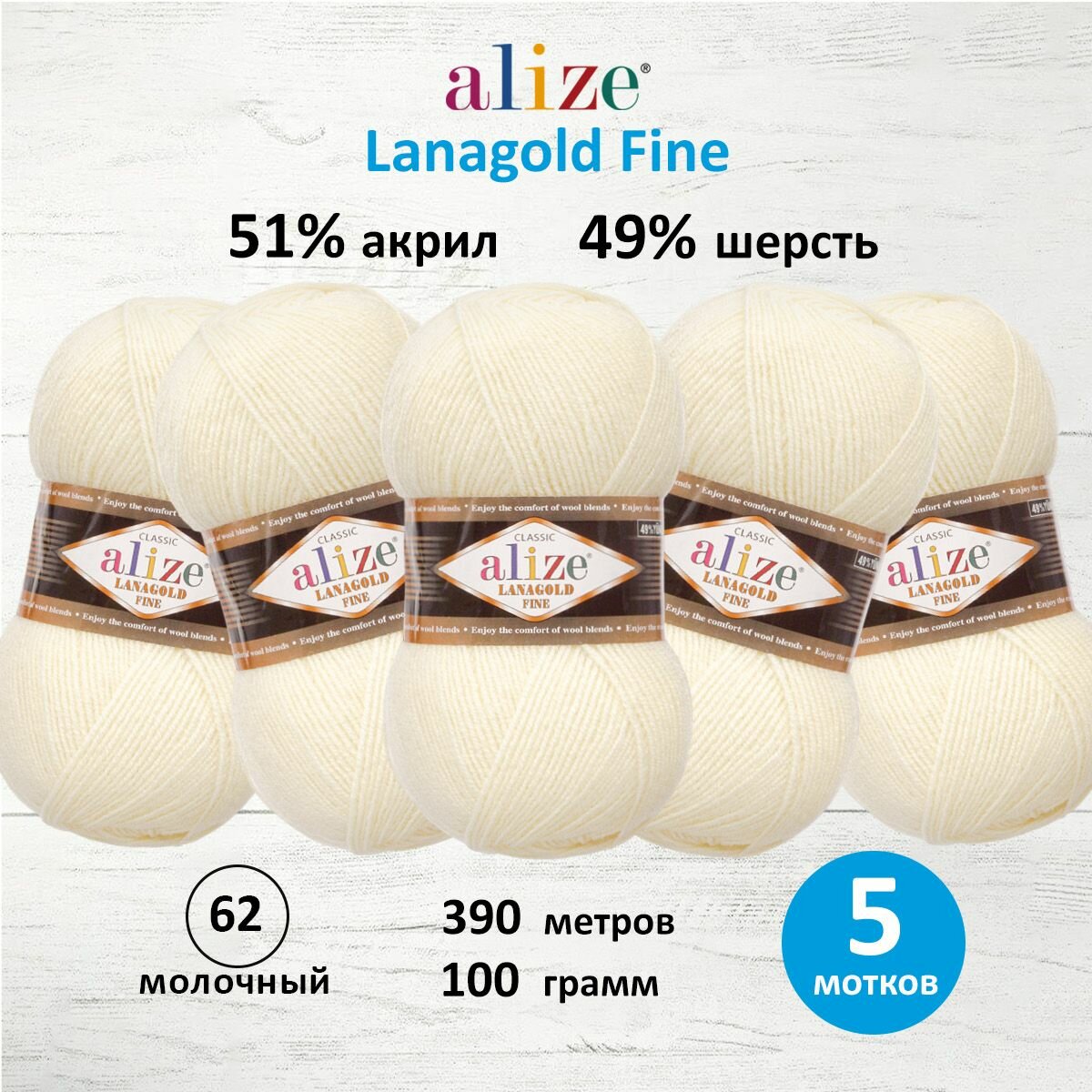 Пряжа для вязания ALIZE 'Lanagold fine', 100г, 390м (49%шерсть, 51% акрил) (62 молочный), 5 мотков информация: