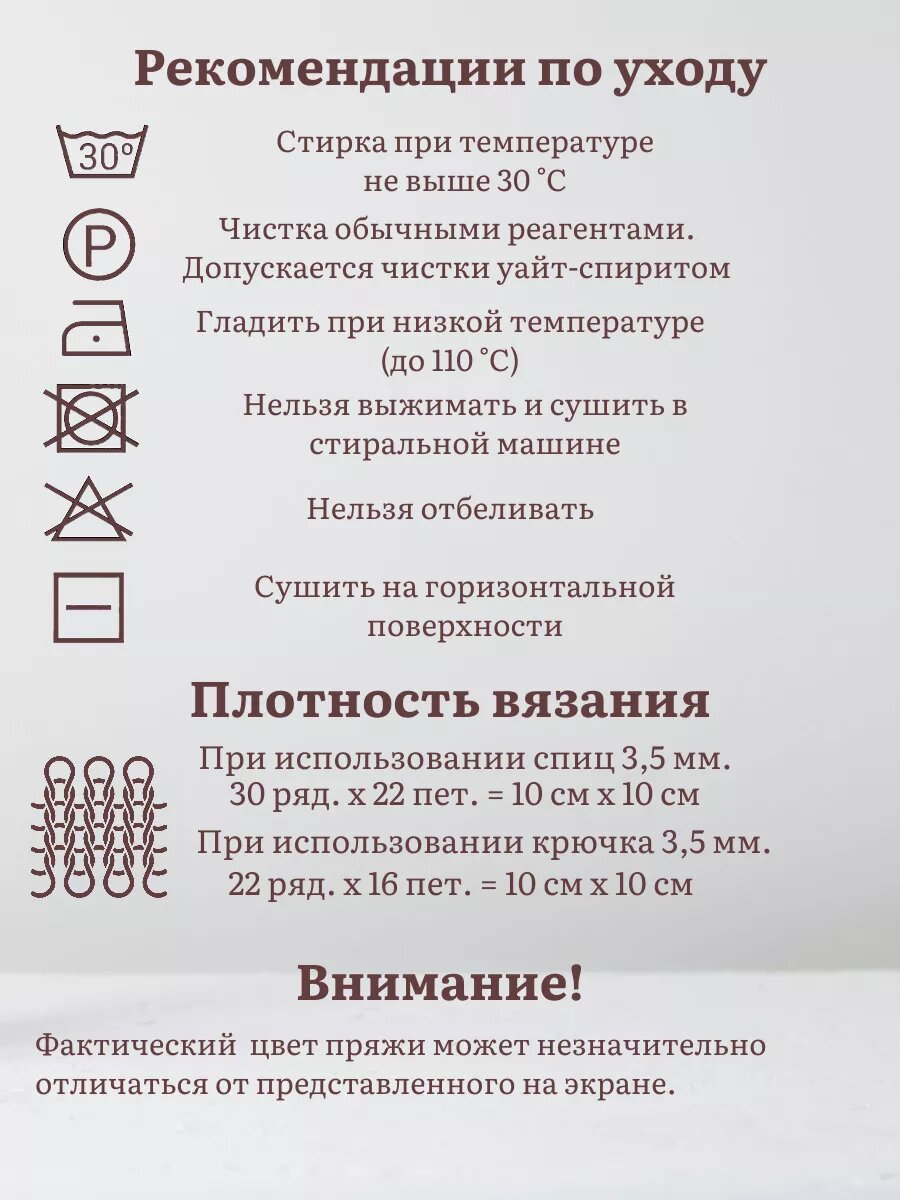 | Плотность вязания для образца 10х10 см | 20 рядов х 18 петель спицы 4.5, 16 рядов Х 14 петель крючок 5 |