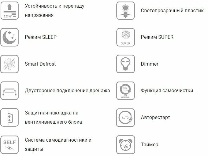 | Дополнительные функции | Follow me / автоперезапуск / ионизация / разморозка внешнего блока / самодиагностика / самоочистка внутреннего блока / система против образования льда / теплый пуск |