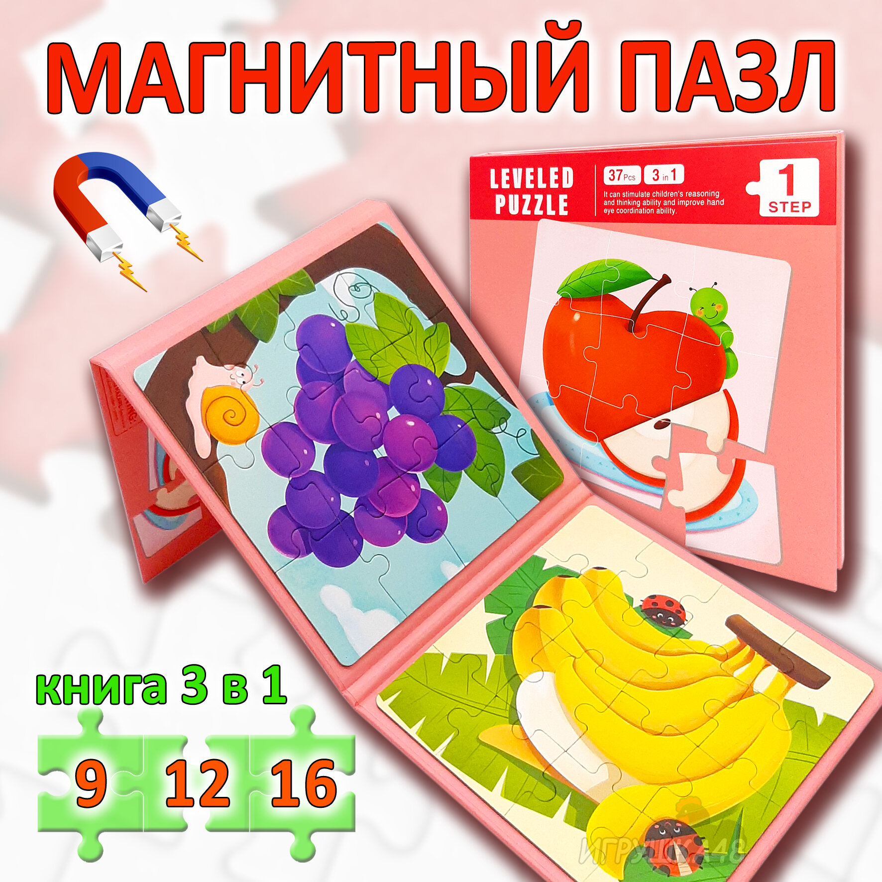 Магнитный пазл для малышей 3 в 1 / Пазл на магнитах игра в дорогу / Набор пазлов разного уровня сложности, 18*18*1,5см, 37 деталей, Фрукты, красный информация: