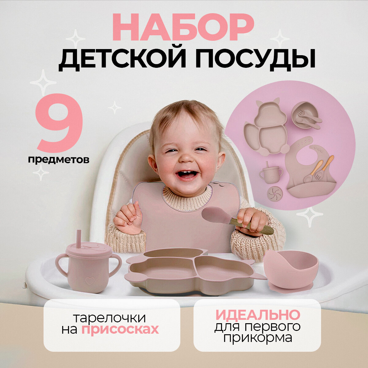 10 цен на Максимальный силиконовый набор детской посуды для кормления малыша (9 предметов) на присосках, Белочка розовая