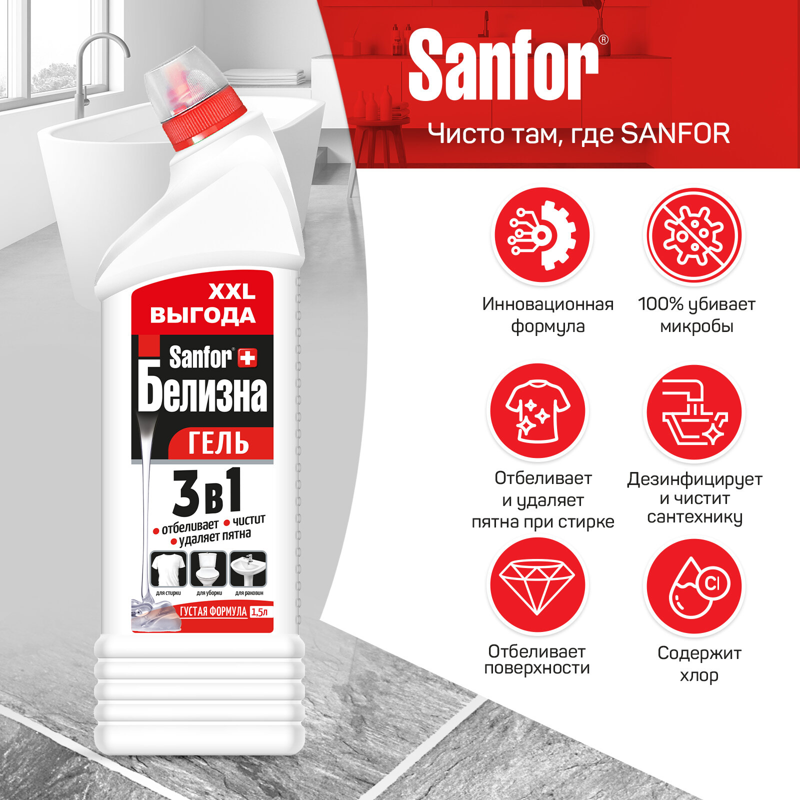 Белизна гель SANFOR 3 в 1, 1,5 л информация:
