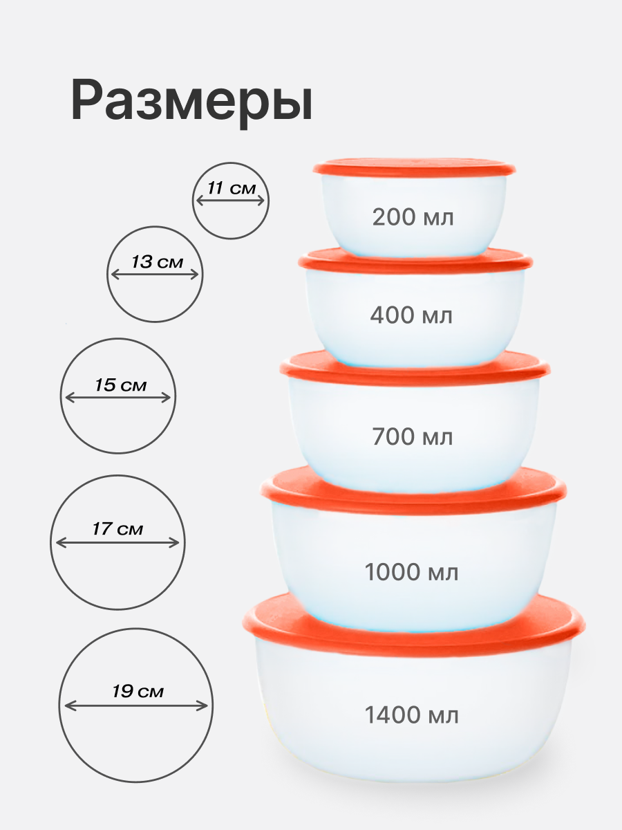| Комплектация | Набор контейнеров для еды 5 штук: 200 мл - 1 шт., 400 мл - 1 шт., 700 мл - 1 шт., 1000 мл - 1 шт., 1400 мл - 1 шт. |