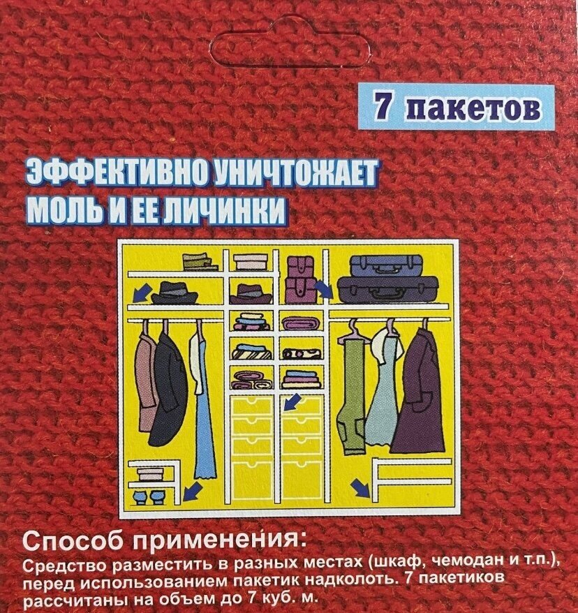| Способ применения | Средство разместить в разных местах (шкаф, чемодан и т.п.). Перед использованием пакетик надколоть. |