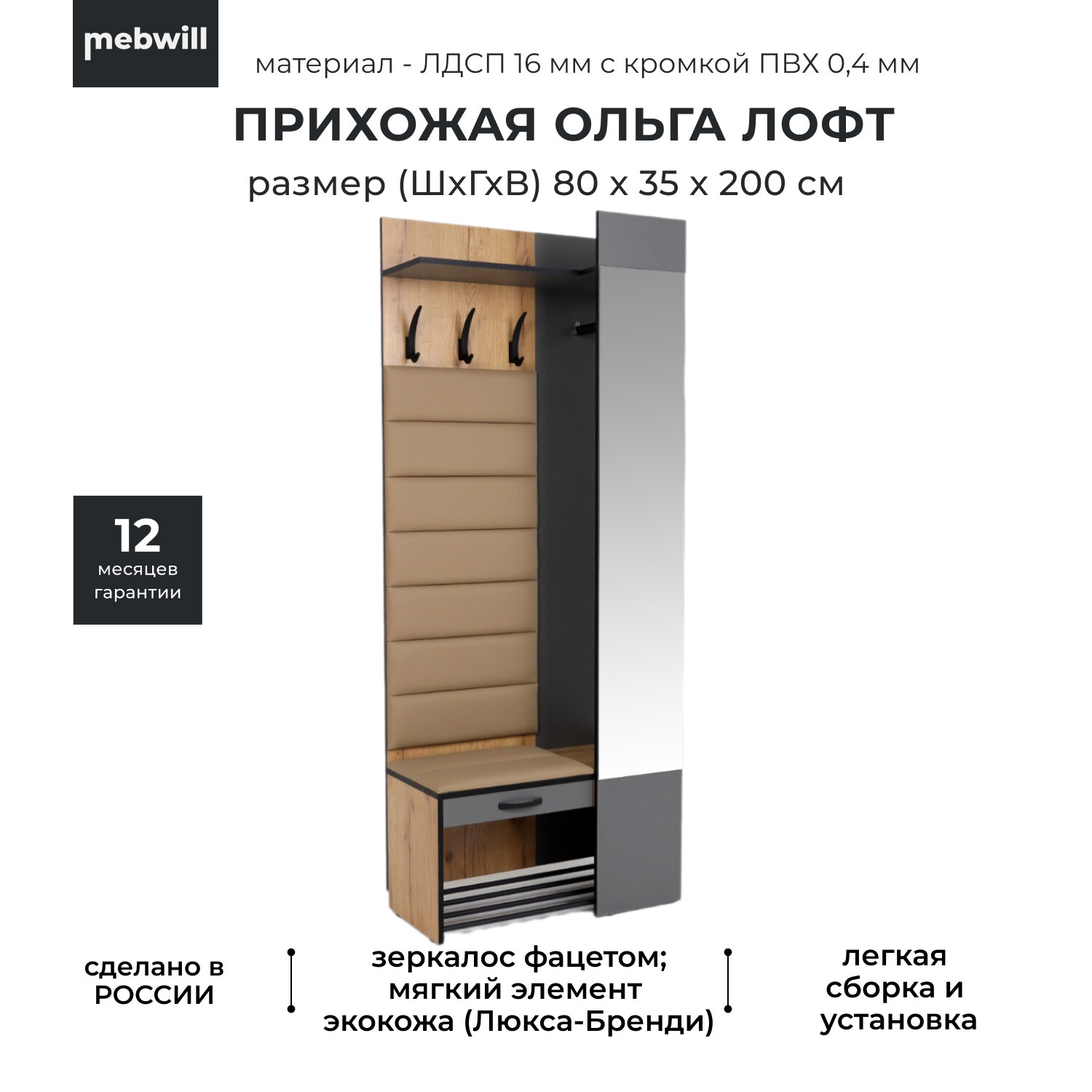 Прихожая мебель в коридор с зеркалом Ольга Лофт 1, 80х35х200 см, цвет дуб крафт золотой/темно-серый 18 490 ₽