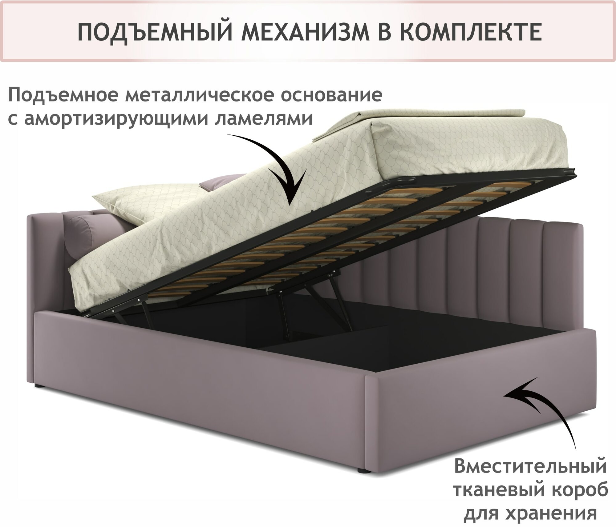 Кровать Milena Zeppelin 120х200 лиловая подъемная, из велюра, с ортопедическими ламелями и ящиком для хранения информация: