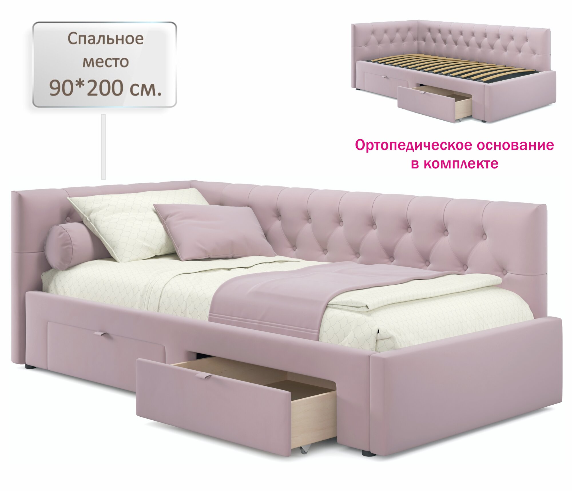 Односпальная кровать-тахта угловая Afelia 900 лиловая Zeppelin ортопед 90х200, из велюра с ящиками информация: