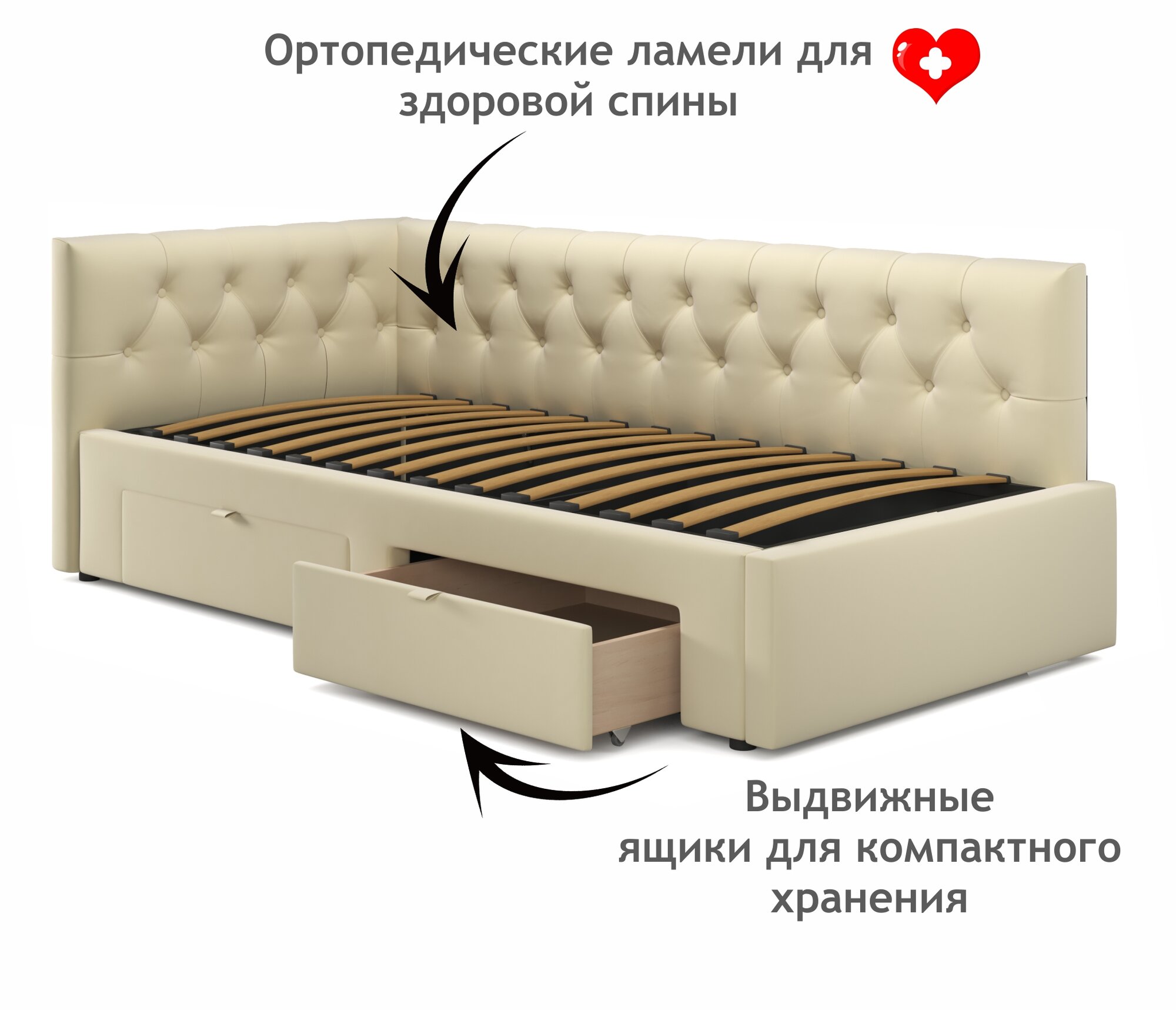 Односпальная кровать-тахта угловая Afelia 900 бежевая Zeppelin ортопед, 90х200, из велюра, с ящиками информация: