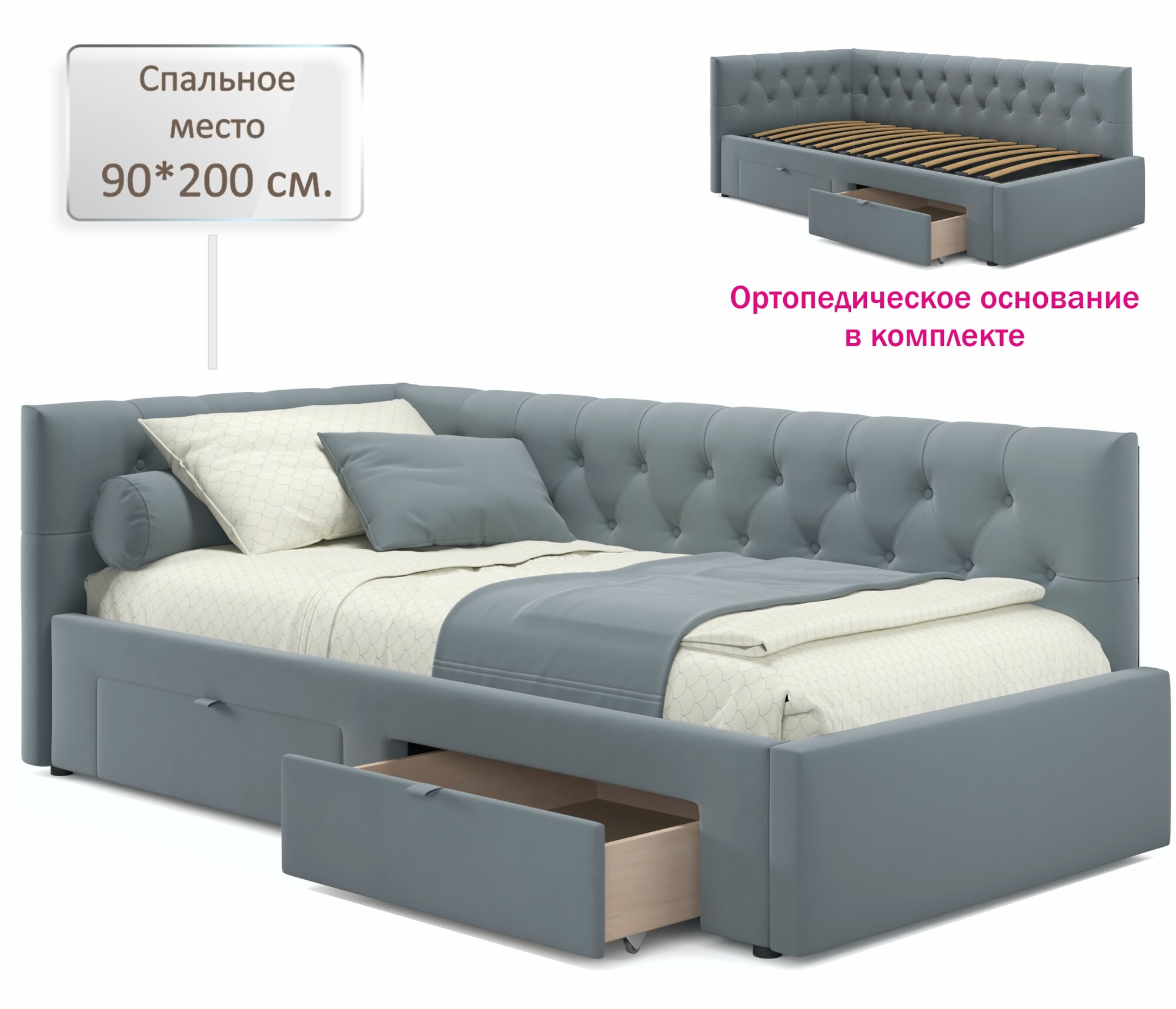 10 цен на Односпальная кровать-тахта угловая Afelia 900 серая Zeppelin ортопед 90х200, мягкая из велюра, с ящиками