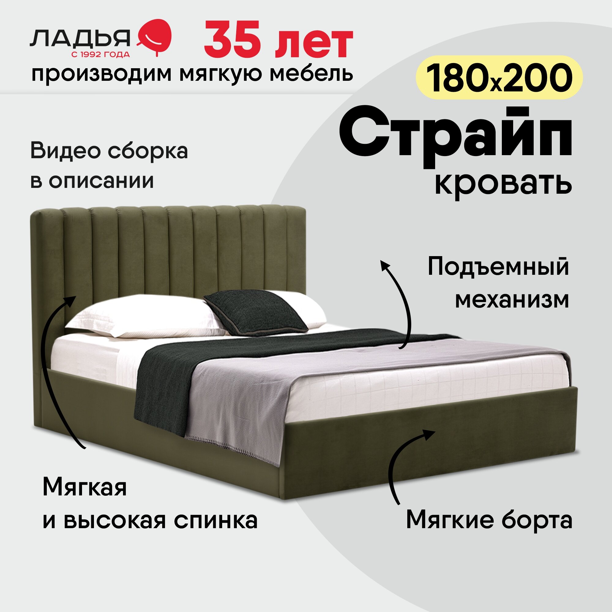 Двуспальная кровать Страйп 180х200 с подъемным механизмом, Ладья, с мягким изголовьем для дома и спальни, ортопедическое основание, ящик для белья, Сonfetti Olive информация: