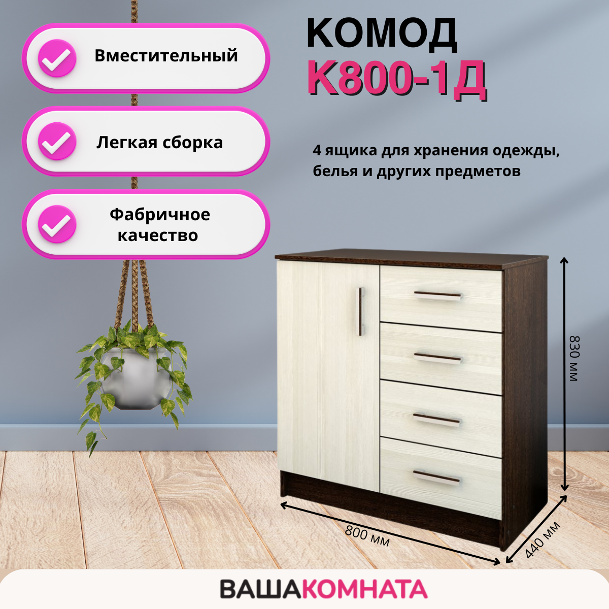 | Комплектация | Комод с 4-мя ящиками. Отсек с дверцей и полкой. |