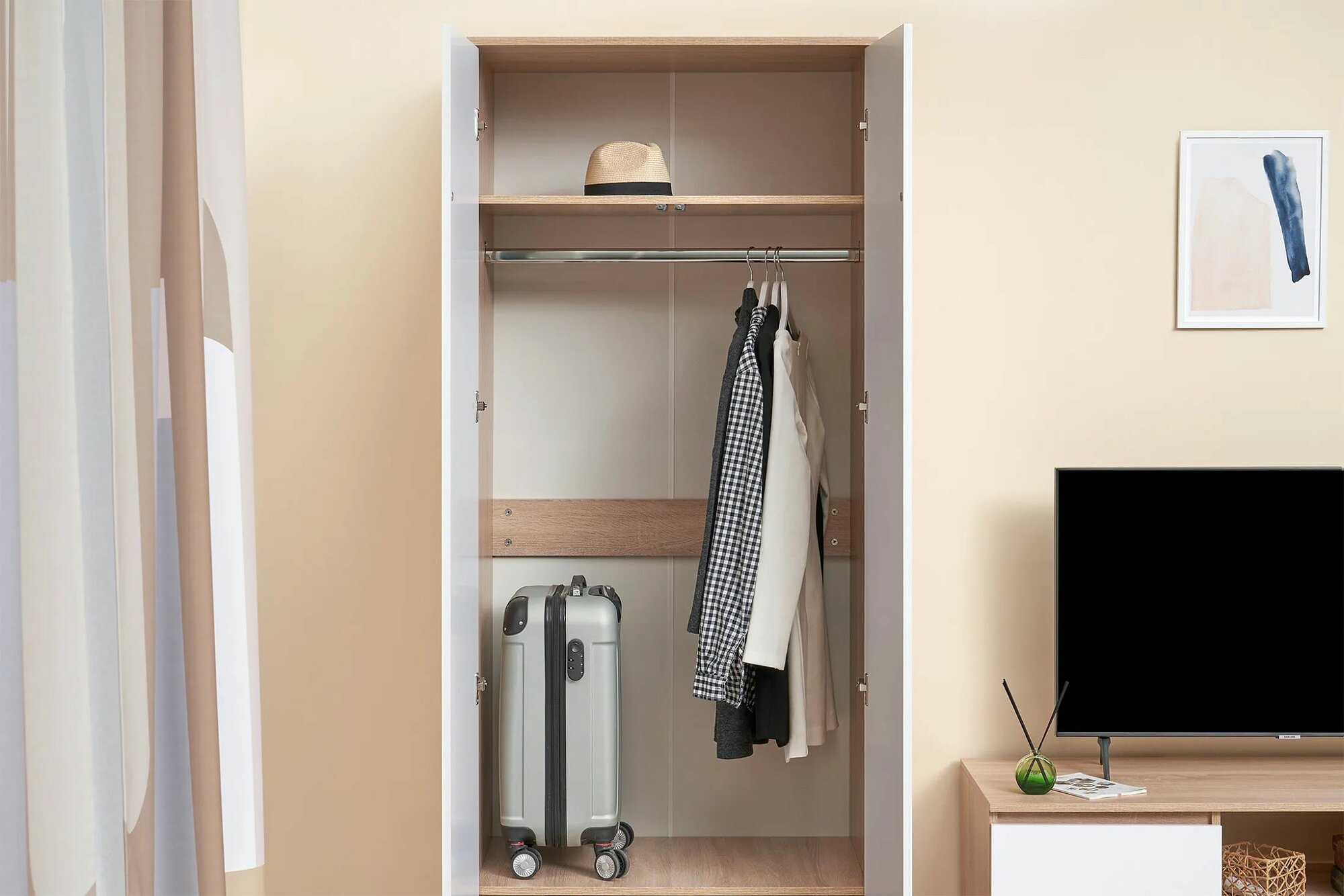 Шкаф для одежды распашной Нонтон Луас, 120 см, 7 полок и штанга, белый глянец