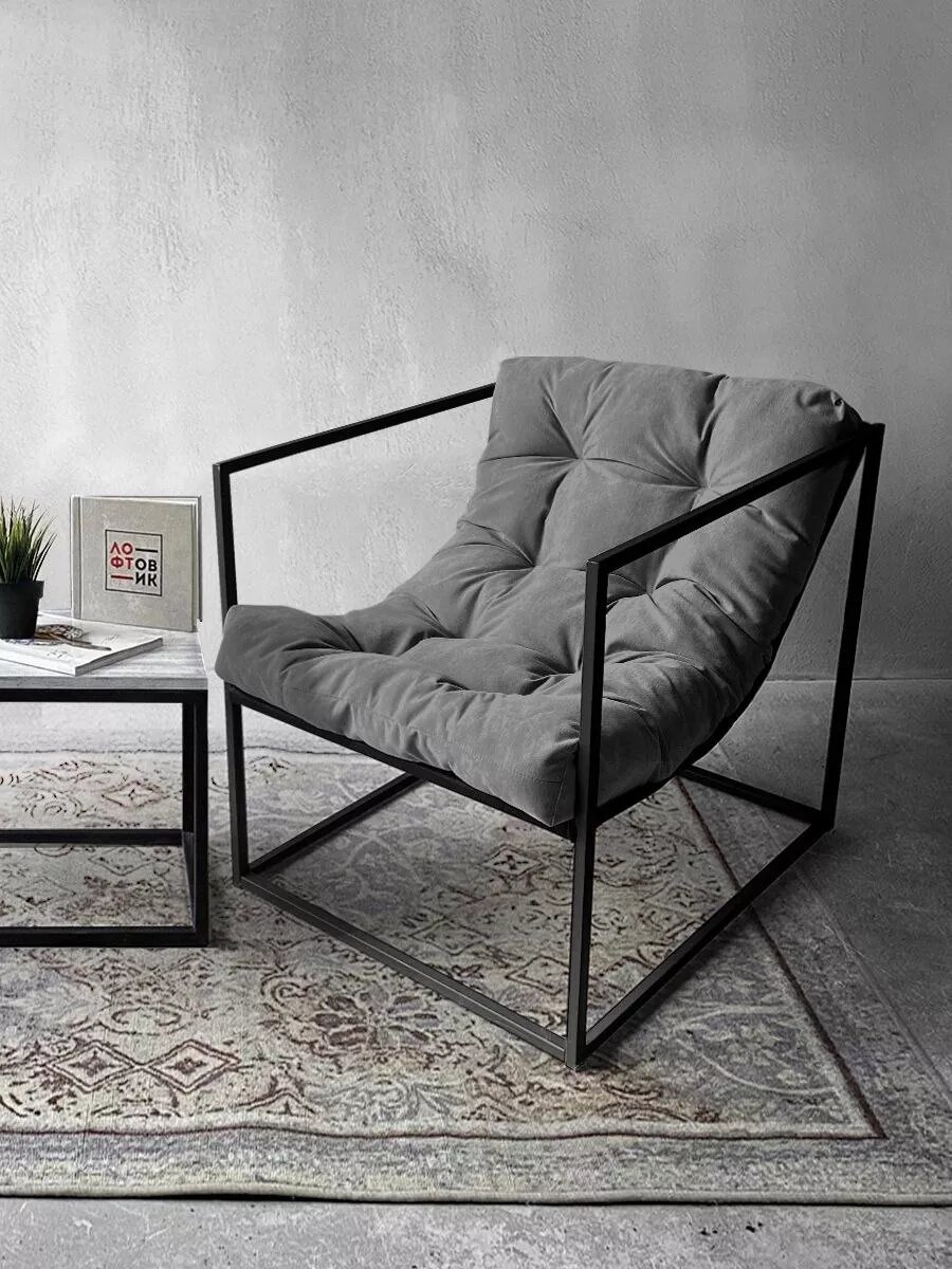 Кресло мягкое удобное для отдыха, уличное, на балкон, на веранду, в стиле лофт, минимализм, Лофтовик + Серый велюр 6 700 ₽