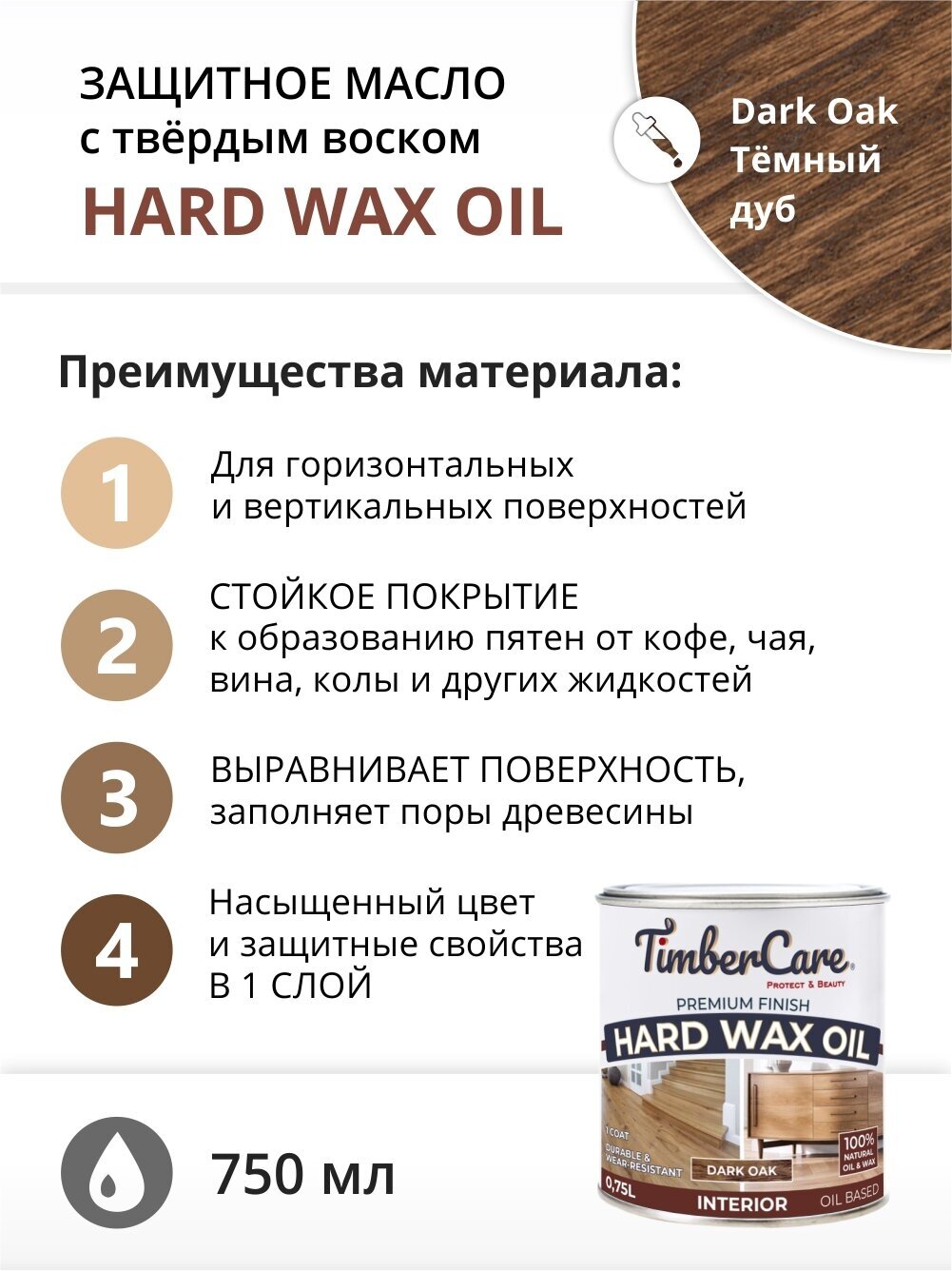 Масло для дерева и мебели с твердым воском TimberCare Hard Wax Color Oil, быстросохнущие для внутренних работ, Темный дуб/ Dark Oak, 0.75 л информация: