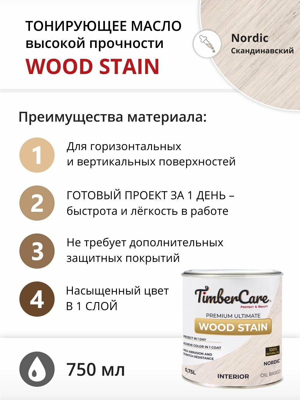 Масло для дерева и мебели TimberCare Wood Stain, быстросохнущие масла для дерева для внутренних работ, Скандинавский/ Nordic, 0.75 л информация: