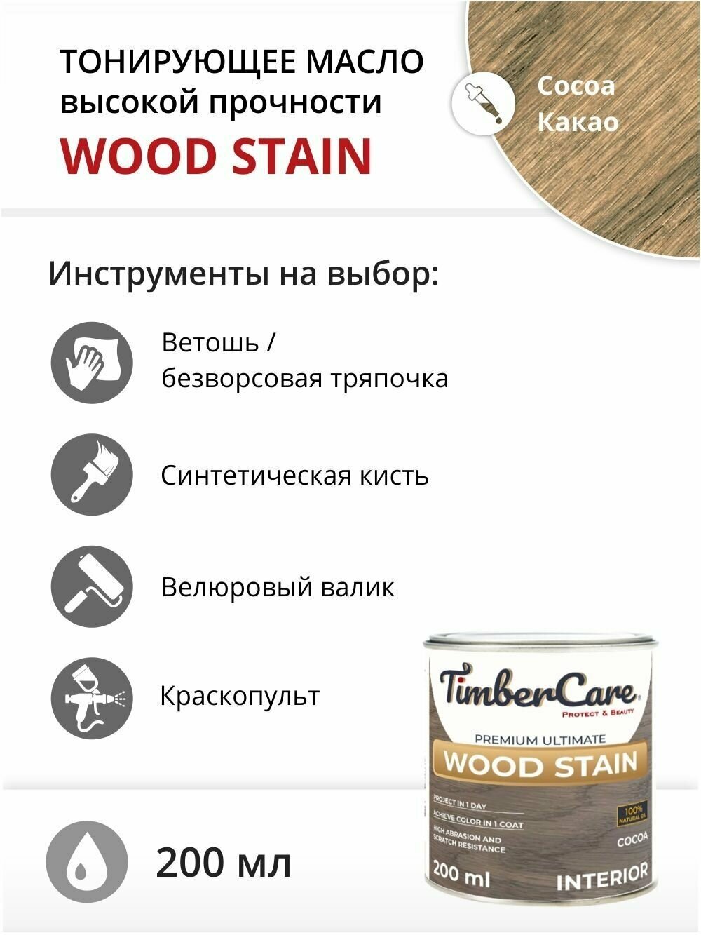 Масло для дерева и мебели TimberCare Wood Stain, быстросохнущие масла для дерева для внутренних работ, Какао/ Cocoa, 0.2 л информация: