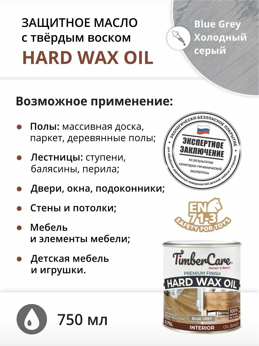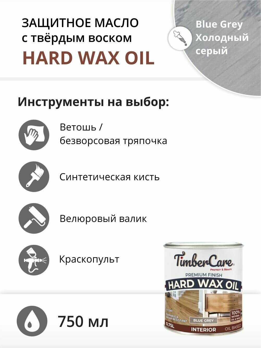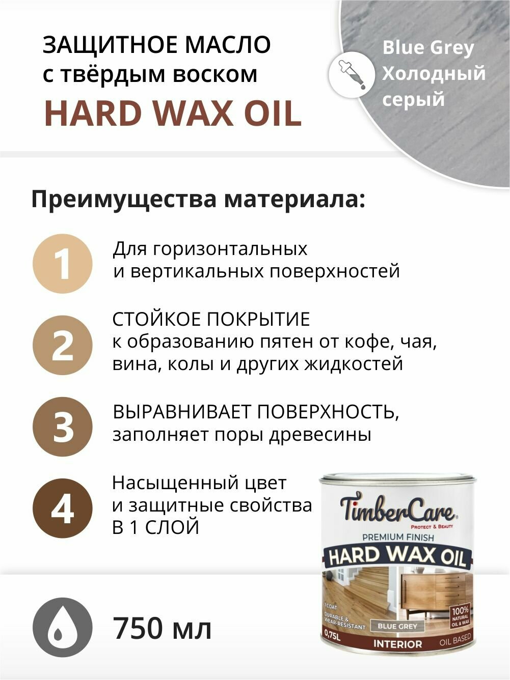 Масло для дерева и мебели с твердым воском TimberCare Hard Wax Color Oil, быстросохнущие для внутренних работ, Серый холодный/ Blue Gray, 0.75 л информация: