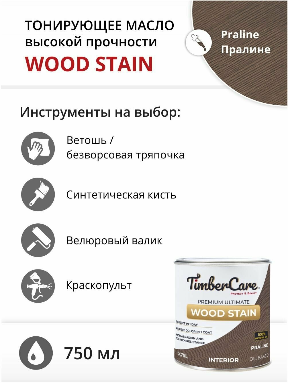 Масло для дерева и мебели TimberCare Wood Stain, быстросохнущие масла для дерева для внутренних работ, Пралине/ Praline, 0.75 л информация:
