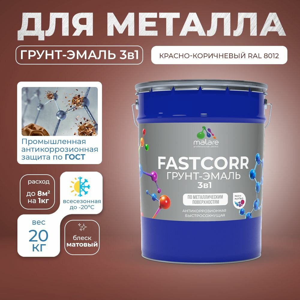 Грунт-эмаль по ржавчине 3 в 1 Malare FastCorr краска для металла, антикоррозионная износостойкая быстросохнущая RAL 8012, красно-коричневый, матовая, 20 кг. информация: