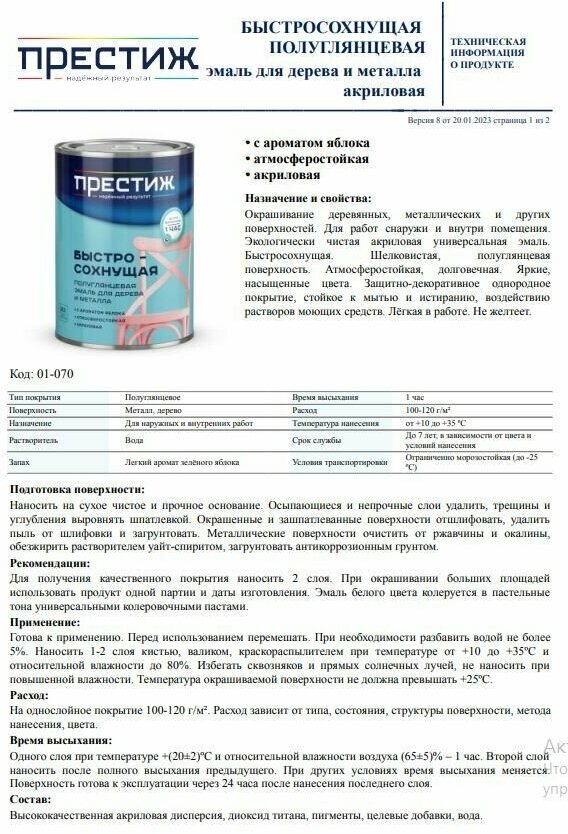 0 отзывов, средняя оценка 0. Чтобы купить «Эмаль быстросохнущая для дерева и металла Престиж, акриловая, полуглянцевая, 0,9 кг, бежевая, 1шт, металлическая банка» по лучшей цене мы сканируем авито, алиэкспресс, маркет, озон, савеловский, плеер, горбушку, беру, официальные сайты и находим минимальную. Администрация не несет ответсвенность актуальность цен на Эмаль быстросохнущая для дерева и металла Престиж, акриловая, полуглянцевая, 0,9 кг, бежевая, 1шт, металлическая банка, более подробно узнавайте на сайте магазина.