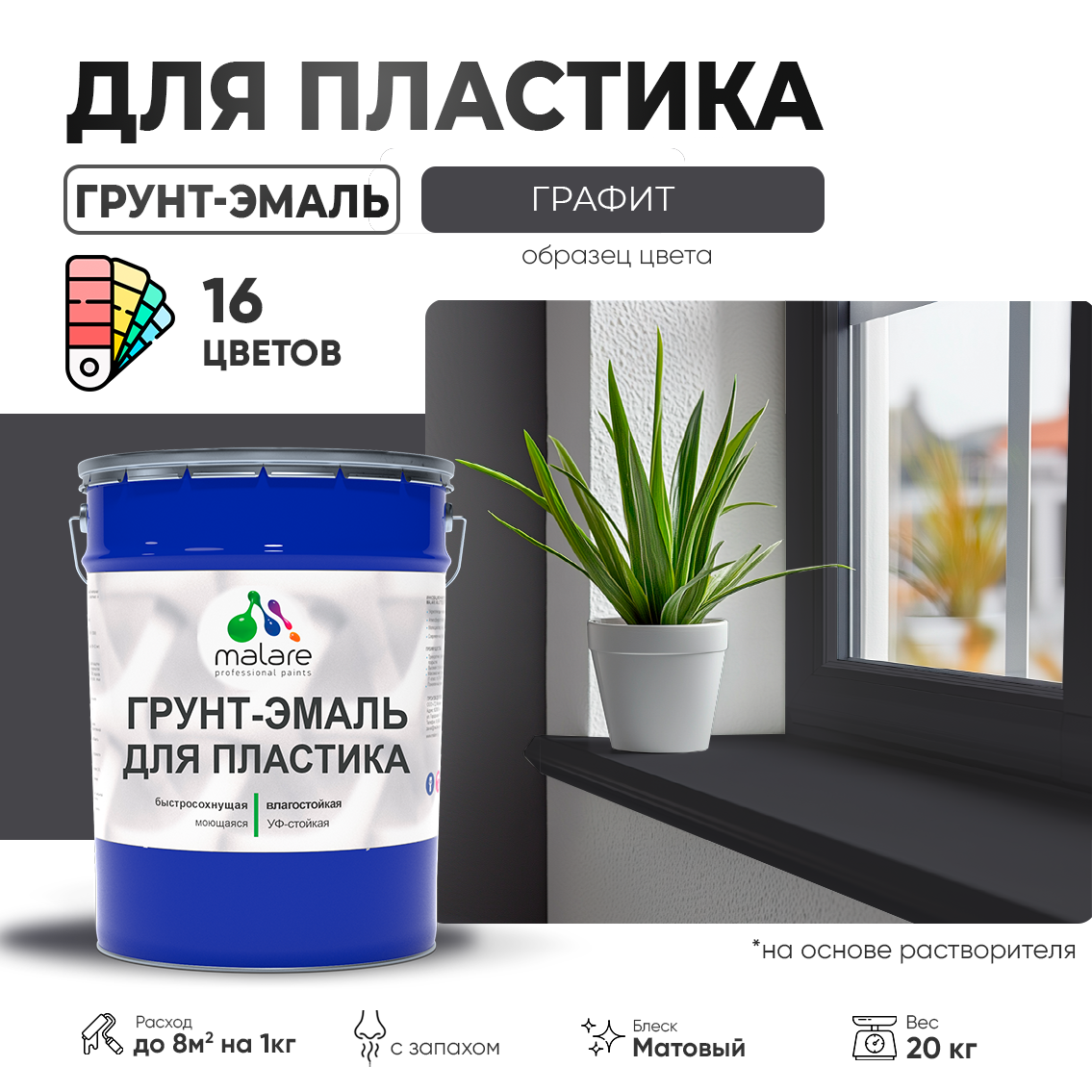 Грунт-Эмаль, Краска Malare 3 в 1 для пластика, окон и подоконников, сайдинга, быстросохнущая, матовый, графитово-серый (тёмный), 20 кг. информация: